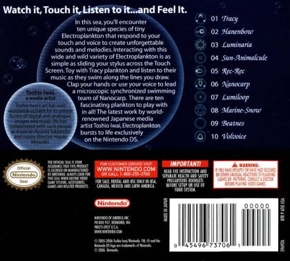 In Electroplankton, art and music collide to create a wildly fresh interactive audio experience. Players will encounter 10 unique species that respond to their touch and voice to create unforgettable sounds and melodies. Interacting with this wide and wild variety of Electroplankton is as simple as sliding the stylus across the touch screen. Toy with Tracy plankton and listen to their music as they swim along drawn lines. Players clap their hands or use their voices to lead a microscopic synchronized swimming team of Nanocarp. There are 10 fascinating plankton to play with in all.