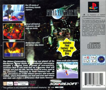 Featuring seamless 3D gameplay and animation, Final Fantasy VII contains hundreds of pre-rendered, computer-generated backgrounds and features real-time battles, vast map screens, and a complex and engrossing storyline. Published on three CDs, Final Fantasy VII will be one of the largest and most richly detailed gaming experiences ever created.