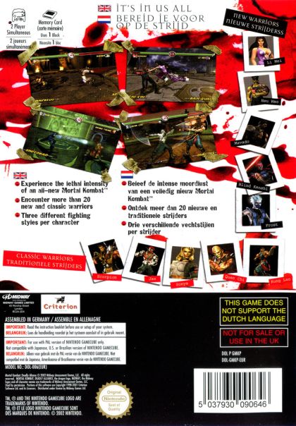 Players engage in hand-to-hand and special-weapon combat, executing secret moves and combinations with new fatalities and deadly body blows. Lethal new warriors are added to the mix along with the return of Mortal Kombat classics -- Scorpion, Raiden, Sub-Zero, and Sonya. Hyper-realistic, Mortal Kombat: Deadly Alliance features progressive physical damage that allows players to view the inevitable demise of their opponents while utilizing three unique fighting styles for each warrior, creating nearly unlimited fighting possibilities.