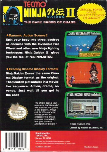 Dynamic action scenes! Split your body into three, destroy all enemies with the Invincible Fire Wheel and other new Ninja fighting techniques! Ninja Gaiden II gives you the feel of real Ninjutsu! Exciting cinema display format! Ninja Gaiden II uses the same Cinema Display Format as the original. The fiendish plot unfolds in a movie-like sequence. Action, drama, revenge. Just wait till you get to the end!