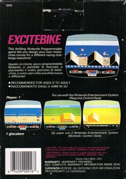 This thrilling Nintendo programmable game lets you vary the obstacles, change the sequence of events, and increase the racing challenge time and time again! You'll start out in a Nintendo designed preliminary race, and move through a series of increasingly difficult challenge races! You'll face crazy curves, hairpin turns, daredevil jumps, and some very fierce motorcross competition, as you race your bike towards the checkered flag. This thrilling test of driving strategy and skill will keep you riveted to the screen for hours!