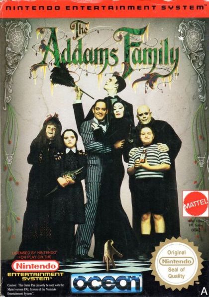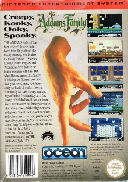 The Addams Family has been evicted! To save their home from Tully Alford, the family attourney, who is after the family fortune -- Morticia, Lurch, Granny, Pugsley and Wednesday have gone to the house to reason with him. But when Gomez arrives, his family is missing! As Gomez, you must save your loved ones, your home and your loads of wealth. Freeing your family will take money, bags and bags of it; but fortunately, you'll find stashes of cash hidden all over the house. You'll have to watch out for scary obstacles like falling spikes, frightening monsters and ghosts. You'll need to look for clues and solve many mysterious puzzles as you search for your family. You may even need someThing (TM) to help you -- buy you'll have to find him first! Get a move on... 'cause you're gonna make a call on THE ADDAMS FAMILY!