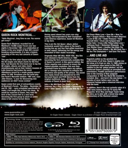 The only Queen concert ever filmed in its entirety, this 1981 Montreal Live Aid performance has been digitally restored and remixed. Featuring dynamic front man Freddie Mercury, the band puts on a high-octane show for a crowd of excited fans. Songs include "We Will Rock You," "We Are the Champions," "Somebody to Love," "Get Down Make Love," "Under Pressure," "Crazy Little Thing Called Love," "Killer Queen," "Bohemian Rhapsody" and many more.