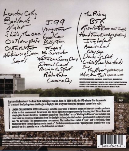 Bruce Springsteen & The E Street Band's London Calling: Live In Hyde Park concert film is of the Boss and his band's performance at London's Hard Rock Calling Festival on June 28, 2009 in HD. The film documents 27 tracks of live Springsteen that begin in daylight and progress through a gorgeous sunset into night. The set list spans from the Born To Run era to Working On a Dream and includes rare covers such as The Clash's "London Calling", Jimmy Cliff's "Trapped", The Young Rascals' "Good Lovin'", and Eddie Floyd's "Raise Your Hand". Springsteen also performs fan favorite "Hard Times (Come Again No More)". Brian Fallon from The Gaslight Anthem joins the band as a guest vocalist on Springsteen's own "No Surrender".
