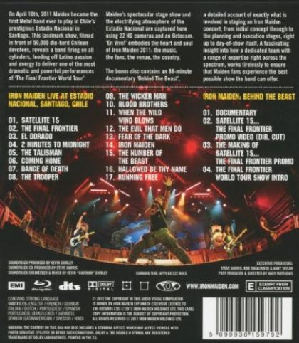 En Vivo! was filmed on 10th April 2011 in front of over 50,000 ecstatic fans at the Estadio Nacional, Santiago during the Round the World in 66 Days leg of The Final Frontier World Tour, and captures a magnificent performance by the band, ardently embraced by the legendary latino passion and energy of their Chilean fans.