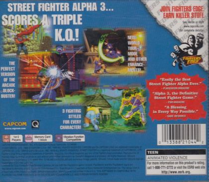 Street Fighter Alpha 3 features 3 modes: The Arcade mode is a direct translation of the arcade version. Versus Mode allows you to select all playable characters. World Tour Mode, allows you to select a character to fight opponents throughout the world.