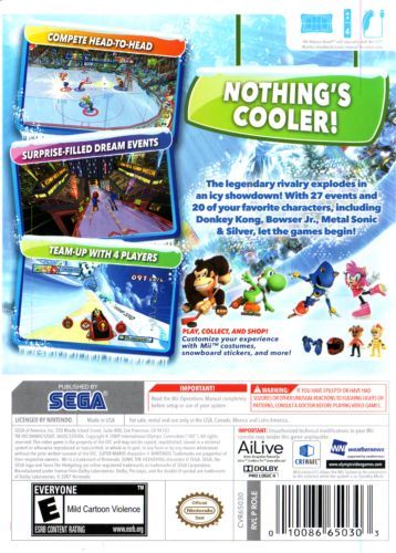 The rivalry of Team Mario and Team Sonic explodes in an all new winter sports competition — Mario & Sonic at the Olympic Winter Games. Developed exclusively for the Wii video game system and the Nintendo DS system, this sports party game is a follow-up to the smash hit Mario & Sonic at the Olympic Games. This game will allow players to take to the snow and ice of Vancouver and Whistler, Host Cities of the 2010 Winter Games, and test their Olympic Spirit in competitive events through their favorite Mario and Sonic characters. With an assortment of new challenging Dream Events and surprises from the world of Mario and Sonic, the stage is set for a winter Olympic experience like no other. Grab your Wii Remote/Nunchuk, Nintendo DS and Wii Balance Board, and get ready to go for gold!