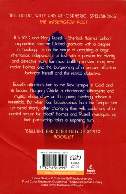 It is 1921 and Mary Russell--Sherlock Holmes's brilliant apprentice, now an Oxford graduate with a degree in theology - is on the verge of acquiring a sizable inheritance. Independent at last, with a passion for divinity and detective work, her most baffling mystery may now involve Holmes and the burgeoning of a deeper affection between herself and the retired detective. Russell's attentions turn to the New Temple of God and its leader, Margery Childe, a charismatic suffragette and a mystic, whose draw on the young theology scholar is irresistible. But when four bluestockings from the Temple turn up dead shortly after changing their wills, could sins of a capital nature be afoot? Holmes and Russell investigate, as their partnership takes a surprising turn.