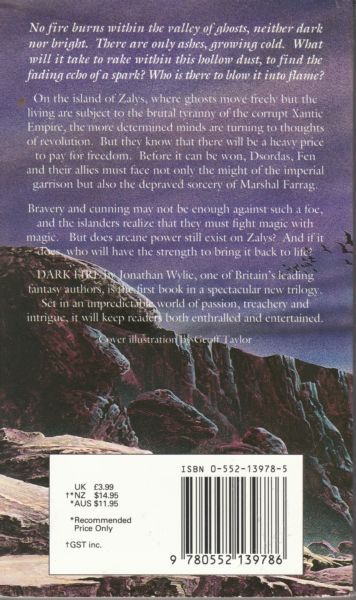 No fire burns within the valley of ghosts, neither dark nor bright. There are only ashes, growing cold. What will it take to rake within this hollow dust, to find the fading echo of a spark? Who is there to blow it into flame?On the island of Zalys, where ghosts move freely but the living are subject to the brutal tyranny of the corrupt Xantic Empire, the more determined minds are turning to thoughts of revolution. But they know that there will be a heavy price to pay for freedom. Before it can be won, Dsordas, Fen and their allies must face not only the might of the imperial garrison but also the depraved sorcery of Marshal Farrag.Bravery and cunning may not be enough against such a foe, and the islanders realize that they must fight magic with magic. But does arcane power still exist on Zalys? And if it does, who will have the strength to bring it back to life?Dark Fire by Jonathan Wylie, one of Britain's leading fantasy authors, is the first book in a spectacular new trilogy. Set in an unpredictable world of passion, treachery and intrigue, it will keep readers both enthralled and entertained.