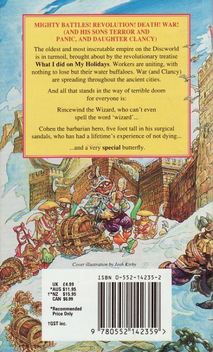 Mighty Battles! Revolution! Death! War! (And His Sons Terror And Panic, And Daughter Clancy)The Oldest And Most Inscrutable Empire On The Discworld Is In Turmoil, Brought About By The Revolutionary Treatise What I Did On My Holidays. Workers Are Uniting, With Nothing To Lose But Their Water Buffaloes. Warlords Are Struggling For Power. War (And Clancy) Are Spreading Throughout The Ancient Cities.And All That Stands In The Way Of Terrible Doom For Everyone Is:Rincewind The Wizard, Who Can'T Even Spell The Word 'Wizard'...Cohen The Barbarian Hero, Five Foot Tall In His Surgical Sandals, Who Has Had A Lifetime'S Experience Of Not Dying......And A Very Special Butterfly.