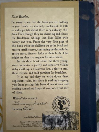 Violet, Klaus, and Sunny Baudelaire are intelligent children. They are charming, and resourceful, and have pleasant facial features. Unfortunately, they are exceptionally unlucky. In the first two books alone, the three youngsters encounter a greedy and repulsive villain, itchy clothing, a disastrous fire, a plot to steal their fortune, a lumpy bed, a deadly serpent, a large brass reading lamp, a long knife, and a terrible odour. In the tradition of great storytellers, from Dickens to Dahl, comes an exquisitely dark comedy that is both literary and irreverent, hilarious and deftly crafted. Never before has a tale of three likeable and unfortunate children been quite so enchanting, or quite so uproariously unhappy. Ages 10+