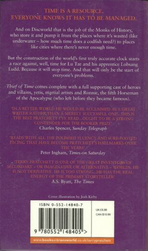 Time is a resource. Everyone knows it has to be managed. And on the Discworld that is the job of the monks of history, who store it and pump it from the places where it's wasted (like the underwater—how much time does a codfish need?) to places like cities, where there's never enough time. But the construction of the world's first truly accurate clock starts a race against, well, time for Lu Tze and his apprentice, Lobsang Ludd. Because it will stop time. And that will only be the start of everyone's problems. Thief of Time comes complete with a full supporting cast of heroes, villains, yetis, martial artists and Ronnie, the fifth horseman of the apocalypse (who left before they became famous).