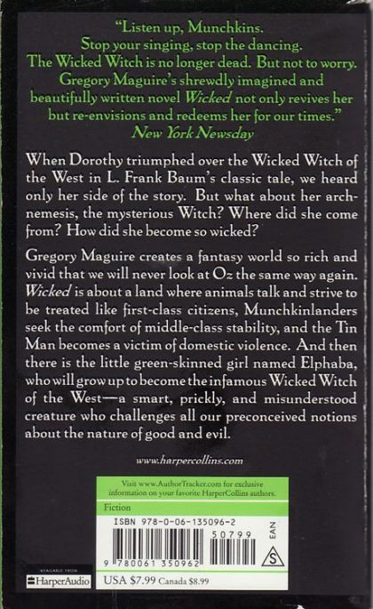 When Dorothy triumphed over the Wicked Witch of the West in L. Frank Baum's classic tale, we heard only her side of the story. But what about her arch-nemesis, the mysterious witch? Where did she come from? How did she become so wicked? And what is the true nature of evil? Gregory Maguire creates a fantasy world so rich and vivid that we will never look at Oz the same way again. Wicked is about a land where animals talk and strive to be treated like first-class citizens, Munchkinlanders seek the comfort of middle-class stability and the Tin Man becomes a victim of domestic violence. And then there is the little green-skinned girl named Elphaba, who will grow up to be the infamous Wicked Witch of the West, a smart, prickly and misunderstood creature who challenges all our preconceived notions about the nature of good and evil.