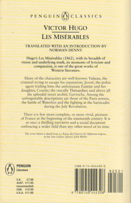 Victor Hugo's tale of injustice, heroism and love follows the fortunes of Jean Valjean, an escaped conviict determined to put his criminal past behind him. His attempts to become a respected member of the community are constantly put under threat: by his own conscience, when, owing to a case of mistaken identity, another man is arrested in his place; and by the relentless investigations of the dogged policeman Javert. It is not simply for himself that Valjean must stay free, however, for he has sworn to protect the baby daughter of Fantine, driven to prostitution by poverty. A compelling and compassionate view of the victims of early nineeenth French society, Les Misérables is a novel on an epic scale, moving inexoraby from the eve of the battle of Waterloo to the July Revolution of 1830.