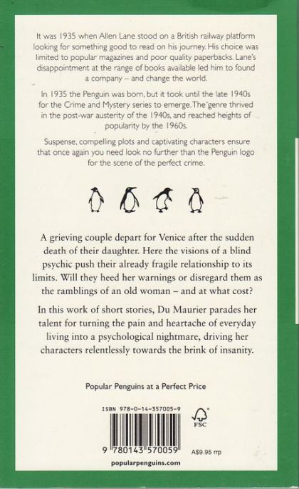A grieving couple depart to Venice after the sudden death of their daughter. Here the visions of a blind psychic push their already fragile relationship to its limits. Will they heed her warnings or disregard the ramblings of an old woman; and at what cost? In this work of short stories, Du Maurier parades her talent for turning the pangs and heartaches of everyday living into psychological nightmares, driving her characters relentlessly towards the brink of insanity. The Green Popular Penguins StoryIt was in 1935 when Allen Lane stood on a British railway platform looking for something good to read on his journey. His choice was limited to popular magazines and poor quality paperbacks. Lane's disappointment at the range of books available led him to found a company - and change the world. In 1935 the Penguin was born, but it took until the late 1940s for the Crime and Mystery series to emerge. The genre thrived in the post-war austerity of the 1940s, and reached heights of popularity by the 1960s. Suspense, compelling plots and captivating characters ensure that once again you need look no further than the Penguin logo for the scene of the perfect crime.