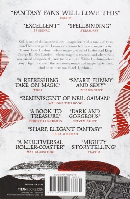 From V.E. Schwab, the critically acclaimed author of Vicious, comes a new universe of daringadventure, thrilling power, and parallel Londons, beginning with A Darker Shade of Magic. Kell is one of the last Travellers -- magicians with a rare, coveted ability to travel between paralleluniverses -- as such, he can choose where he lands. There's Grey London, dirty and boring, withoutany magic, ruled by a mad King George. Then there's Red London, where life and magic arerevered, and the Maresh Dynasty presides over a flourishing empire. White London, ruled bywhoever has murdered their way to the throne -- a place where people fight to control magic, andthe magic fights back, draining the city to its very bones. And once upon a time, there was BlackLondon...but no one speaks of that now. Officially, Kell is the Red Traveller, personal ambassador and adopted Prince of Red London,carrying the monthly correspondences between the royals of each London. Unofficially, Kell is asmuggler, servicing people willing to pay for even the smallest glimpses of a world they'll neversee -- a dangerous hobby, and one that has set him up for accidental treason.