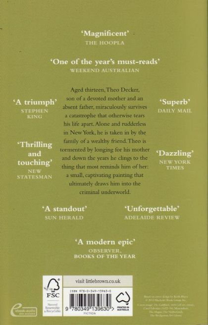 Aged thirteen, Theo Decker, son of a devoted mother and a reckless, largely absent father, survives an accident that otherwise tears his life apart. Alone and rudderless in New York, he is taken in by the family of a wealthy friend. He is tormented by an unbearable longing for his mother, and down the years clings to the thing that most reminds him of her: a small, strangely captivating painting that ultimately draws him into the criminal underworld. As he grows up, Theo learns to glide between the drawing rooms of the rich and the dusty antiques store where he works. He is alienated and in love—and his talisman, the painting, places him at the centre of a narrowing, ever more dangerous circle. 'The Goldfinch' is a haunted odyssey through present-day America and a drama of enthralling power. Combining unforgettably vivid characters and thrilling suspense, it is a beautiful, addictive triumph—a sweeping story of loss and obsession, of survival and self-invention, of the deepest mysteries of love, identity and fate. Winner of the Pulitzer Prize for Fiction 2014.