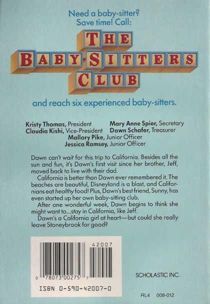 Dawn can't wait for this trip to California. Besides all the sun and fun, it's Dawn's first visit since her brother, Jeff, moved back to live with their dad. California is better than Dawn ever remembered it. The beaches are beautiful, Disneyland is a blast, and Californians eat healthy food! Plus, Dawn's best friend, Sunny, has even started up her own baby-sitting club. After one wonderful week, Dawn begins to think she might want to ... stay in California, like Jeff. Dawn's a California girl at heart - but could she really leave Stoneybrook for good?