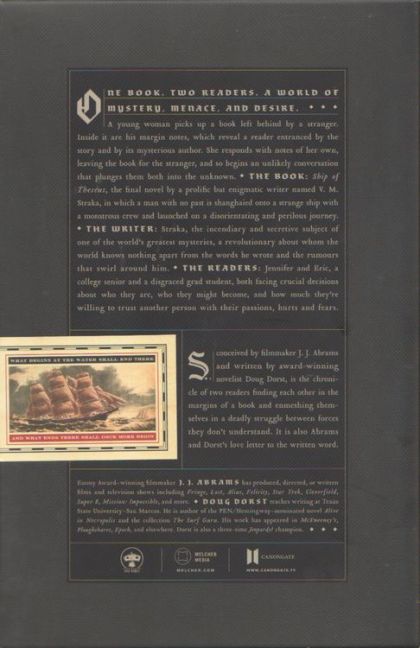 One book. Two readers. A world of mystery, menace and desireA young woman picks up a book left behind by a stranger. Inside it are his margin notes, which reveal a reader entranced by the story and by its mysterious author. She responds with notes of her own, leaving the book for the stranger, and so begins an unlikely conversation that plunges them both into the unknown. THE BOOK: Ship of Theseus, the final novel by a prolific but enigmatic writer named V. M. Straka, in which a man with no past is shanghaied onto a strange ship with a monstrous crew and launched on a disorienting and perilous journey.THE WRITER: Straka, the incendiary and secretive subject of one of the world's greatest mysteries, a revolutionary about whom the world knows nothing apart from the words he wrote and the rumours that swirl around him. THE READERS: Jennifer and Eric, a college senior and a disgraced grad student, both facing crucial decisions about who they are, who they might become, and how much they're willing to trust another person with their passions, hurts and fears.S., conceived by filmmaker J.J. Abrams and written by award-winning novelist Doug Dorst, is the chronicle of two readers finding each other in the margins of a book and enmeshing themselves in a deadly struggle between forces they don't understand. It is also Abrams and Dorst's love letter to the written word.