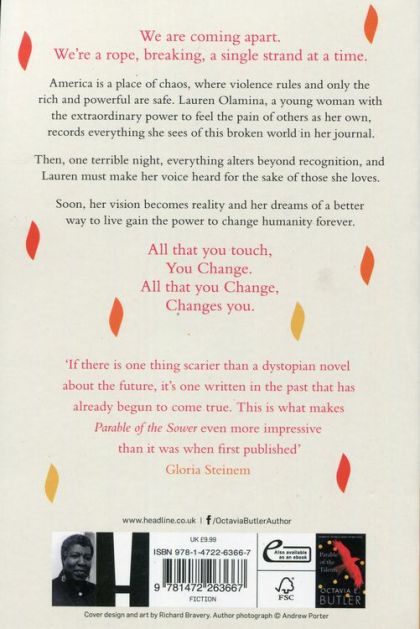 This first EARTHSEED novel by ground-breaking writer Octavia E. Butler feel like a prophetic nod to our current world. If you were glued to THE HANDMAID'S TALE, you'll love this beautiful new edition of a seminal American classic.'If there is one thing scarier than a dystopian novel about the future, it's one written in the past that has already begun to come true. This is what makes PARABLE OF THE SOWER even more impressive than it was when first published' Gloria SteinemWe are coming apart. We're a rope, breaking, a single strand at a time.America is a place of chaos, where violence rules and only the rich and powerful are safe. Lauren Olamina, a young woman with the extraordinary power to feel the pain of others as her own, records everything she sees of this broken world in her journal.Then, one terrible night, everything alters beyond recognition, and Lauren must make her voice heard for the sake of those she loves. Soon, her vision becomes reality and her dreams of a better way to live gain the power to change humanity forever.All that you touch,You Change.All that you Change,Changes you.What readers are saying about Octavia Butler:'KINRED was written in 1979 but could have been written last year. Incredible. I couldn't put it down''Emotionally and viscerally alive and challenging. I don't know how I missed it before now''A masterpiece by a matchless artist. Butler is simply sublime''Reading these books will change your life''A finely crafted work, rife with emotional power, horrifying in its believability, with a message that cannot be ignored’.