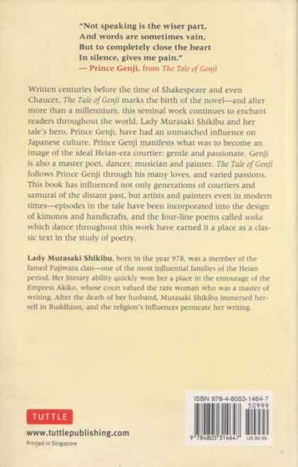 The most famous work of Japanese literature and the world's first novel-written a thousand years ago and one of the enduring classics of world literature.Written centuries before the time of Shakespeare and even Chaucer, The Tale of Genji marks the birth of the novel-and after more than a millennium, this seminal work continues to enchant readers throughout the world. Lady Murasaki Shikibu and her tale's hero, Prince Genji, have had an unmatched influence on Japanese culture. Prince Genji manifests what was to become an image of the ideal Heian era courtier; gentle and passionate. Genji is also a master poet, dancer, musician and painter. The Tale of Genji follows Prince Genji through his many loves and varied passions. This book has influenced not only generations of courtiers and samurai of the distant past, but artists and painters even in modern times-episodes in the tale have been incorporated into the design of kimonos and handicrafts, and the four-line poems called waka which dance throughout this work have earned it a place as a classic text in the study of poetry.This version by Kencho Suematsu was the first-ever translation in English. Condensed, it's a quarter length of the unabridged text, making it perfect for readers with limited time."Not speaking is the wiser part,And words are sometimes vain,But to completely close the heartIn silence, gives me pain."-Prince Genji, in The Tale of Genji