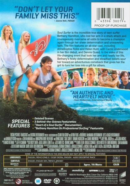 The true story of teen surfer Bethany Hamilton, who lost her arm in a shark attack and courageously overcame all odds to become a champion again, through her sheer determination and unwavering faith.