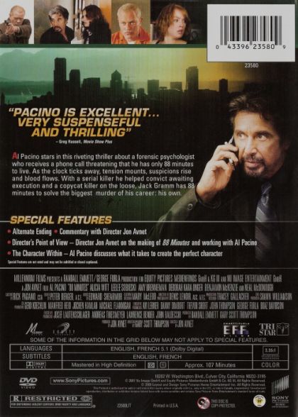 "88 Minutes" focuses on a college professor (Pacino) who moonlights as a forensic psychiatrist for the FBI and receives a death threat claiming he has only 88 minutes to live.