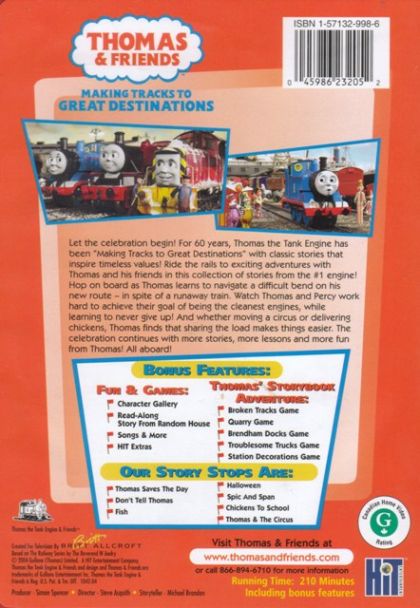 Thomas lends timeless values while enchanting the imagination. In this collection of episodes, Thomas comes to the rescue of the new engine, James, in "Thomas Saves the Day," and in "Halloween," two naughty little diesels give Thomas and Emily quite a fright. Other episodes include "Don't Tell Thomas," "Fish," "Spic and Span," and "Chickens to School."