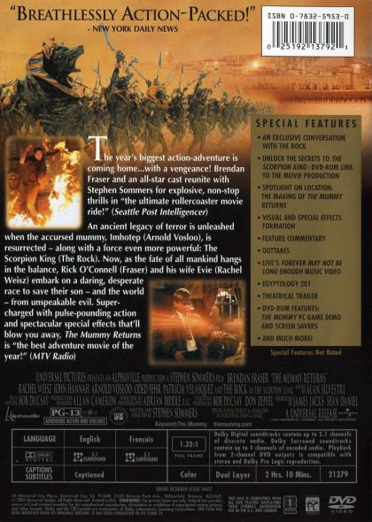 Rick and Evelyn O’Connell, along with their 8-year-old son Alex, discover the key to the legendary Scorpion King’s might: the fabled Bracelet of Anubis. Unfortunately, a newly resurrected Imhotep has designs on the bracelet as well, and isn’t above kidnapping its new bearer, Alex, to gain control of Anubis’s otherworldly army.