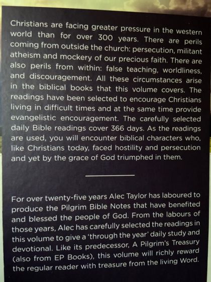 For over twenty-five years Alec Taylor has laboured to produce the Pilgrim Bible Notes that have benefited and blessed the people of God. From the labours of those years, Alec has carefully selected the readings in this volume to give a 'through the year' daily study and devotional. Like its predecessor, A Pilgrim's Treasury (also from EP Books), this volume will richly reward the regular reader with treasure from the living Word. This new volume has readings from: Ezekiel, 1 & 2 Peter, Daniel, the Gospel of John, Ezra, Haggai, Nehemiah, 1, 2 and 3 John, Ecclesiastes, Psalms 1-12 and Revelation. Christians are facing greater pressure in the western world than for over 300 years There are perils coming from outside the church: persecution, militant atheism and mockery of our precious faith. There are also perils from within: false teaching, worldliness, and discouragement. All these circumstances arise in the biblical books that this volume covers. The readings have been selected to encourage Christians living in difficult times and at the same time provide evangelistic encouragement. The carefully selected daily Bible readings cover 366 days. As the readings are used, you will encounter biblical characters who, like Christians today, faced hostility and persecution and yet by the grace of God triumphed in them.