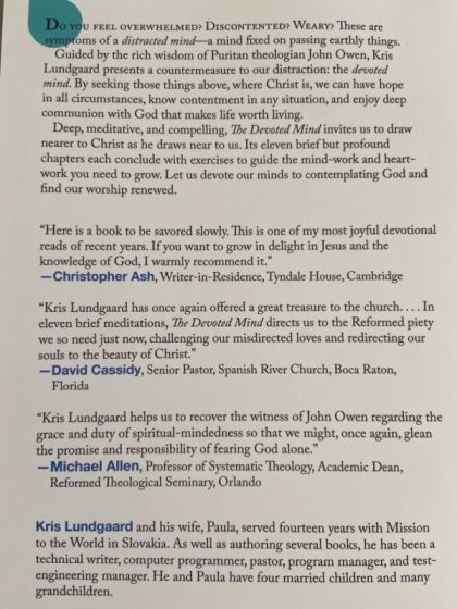 Do you feel overwhelmed? Discontented? Weary? These are symptoms of a distracted mind--a mind fixed on passing earthly things. Guided by the rich wisdom of Puritan theologian John Owen, Kris Lundgaard presents a countermeasure: the devoted mind. By seeking those things above, where Christ is, we can have hope in all circumstances, know contentment in any situation, and enjoy deep communion with God that makes life worth living. Deep, meditative, and compelling, The Devoted Mind invites us to draw nearer to Christ as he draws near to us. Its twelve brief but profound chapters each conclude with exercises to guide the mind-work and heart-work you need to grow. Let us devote our minds to contemplating God and find our worship renewed.
