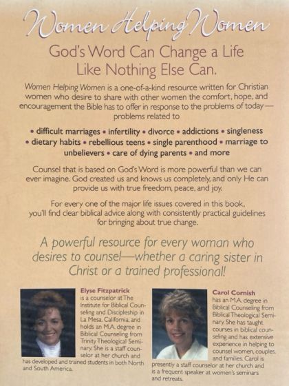 Women Helping Women is a one-of-a-kind resource written for Christian women who desire to share with other women the comfort, hope and encouragement the Bible has to offer in response to the problems of today-problems related to difficult marriages infertility divorce addictions singleness dietary habits rebellious teens single parenthood marriage to unbelievers care of dying parents rebellious teens and more For every one of the major life issues covered in the book, you'll find clear biblical advice along with consistently practical guidelines for bringing about true change. Counsel that is based on God's Word is more powerful than we can ever imagine. God created us and knows us completely, and only He can provide us with true freedom, peace, and joy. A powerful resource for every woman who desires to counsel-whether a caring sister in Christ or a trained professional!