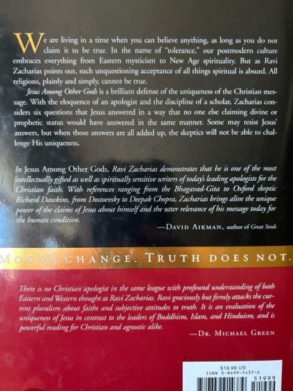 In a world with so many religions, why Jesus?We are living in a time when you can believe anything, as long as you do not claim it to be true. In the name of "tolerance," our postmodern culture embraces everything from Eastern mysticism to New Age spirituality. But as Ravi Zacharias points out, such unquestioning acceptance of all things spiritual is absurd. All religions, plainly and simply, cannot be true.Jesus Among Other Gods provides the answers to the most fundamental claims about Christianity, such as: Aren't all religions fundamentally the same?Was Jesus who He claimed to be?Can one study the life of Christ and demonstrate conclusively that He was and is the way, the truth, and the life? In each chapter, Zacharias considers a unique claim that Jesus made and then contrasts the truth of Jesus with the founders of Islam, Hinduism, and Buddhism with compelling insight and passionate conviction. In addition to an impressive breadth of reading and study, he shares his personal journey from despair and meaninglessness to his discovery that Jesus is who He said He is."In Jesus Among Other Gods, Ravi Zacharias demonstrates that he is one of the most intellectually gifted as well as spiritually sensitive writers of today's leading apologists for the Christian faith. Zacharias brings alive the unique power of the claims of Jesus about himself and the utter relevance of his message today for the human condition." -- David Aikman, author of Great Souls