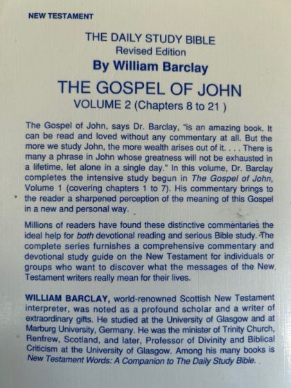 "The Gospel According to Saint John is to many people the most precious book in the Bible," says Dr. Barclay in volume 1. In order to bring the tremendous wealth of this Gospel to the reader, Dr. Barclay has accompanied his unique translation of the text with a detailed commentary almost verse by verse. A comprehensive introduction presents additional material, for the author believes that "there is no book that gains so much from the background from which it emerged." Throughout the book, the deeper meaning of "the spiritual gospel" and its fidelity to the inner truth of Jesus' preaching is clearly and significantly brought home. - Back cover.