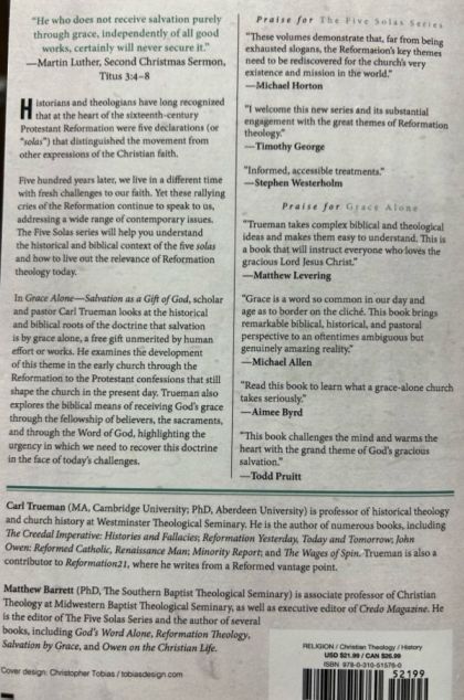 Grace is the heart of the Christian gospel. It's a doctrine that touches the very depths of human existence and makes Christianity such an essential alternative to the dissolution and nihilism of modern culture. Grace Alone guides you into a better doctrinal understanding of the issue and gives you a more glorious vision of an active and saving God. The language of grace fills the Bible so much that to say "grace alone" may not evoke much reflection. Unlike "faith alone," there's no theological controversy among expressions of Christianity. Reviving one of the five great declarations of the Reformation (and one of the more overlooked)--sola Gratia--professor and church historian Carl Trueman: Provides a thorough definition of grace as it's found in the Bible and an overview of biblical references to, and teaching on, grace. Tracks the doctrine of grace as it's been articulated throughout church history, with discussions of Augustine, Pelagius, Thomas Aquinas, and ending with the Reformation and theologies of Luther and Calvin. Looks at the relationship between the means of grace and the modern church, defining the practical implications of the Reformation's understanding of grace. Explanations throughout on the relationship of grace to sin, salvation and glorification, God's sovereignty, the sacraments, and the controversies regarding freewill and predestination. Grace Alone is a beautiful and much-needed revival of this foundational doctrine and the assurance of salvation. --THE FIVE SOLAS-- Historians and theologians have long recognized that at the heart of the sixteenth-century Protestant Reformation were five declarations, often referred to as the "solas." These five statements summarize much of what the Reformation was about, and they distinguish Protestantism from other expressions of the Christian faith: that they place ultimate and final authority in the Scriptures, acknowledge the work of Christ alone as sufficient for redemption, recognize that salvation is by grace alone through faith alone, and seek to do all things for God's glory. The Five Solas Series is more than a simple rehashing of these statements, but instead expounds upon the biblical reasoning behind them, leading to a more profound theological vision of our lives and callings as Christians and churches.