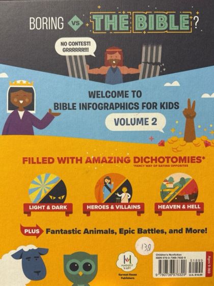 Boring vs. the Bible? No contest!Ding, ding, ding! Ladies and gentlemen, welcome to Bible Infographics for Kids Vol. 2, where we're going to compare some of the most AWESOME opposites from God's Word and witness amazingly EPIC battles between good and evil.See these fierce foes square off in the infographic octagon:Light vs Darkness—and why you'll never see them in the same place.Angels vs Demons—both are powerful, but only one side will win in the end.Feats of God vs Failures of Men—God did incredible things. Men? Not so much.False Gods vs the One True God—separating the many pretenders from the only real contender.Heaven vs Hell—hell is no joke. But neither is heaven. It will be seriously mind-blowing!Plus...fantastic animals, fallen empires, the 411 on the four Gospels, and way more!And yes, we're going to explore more fun and quirky facts from God's Word and gain a bunch of Bible knowledge along the way. Because that's what infographics do. They make the most exciting book in the world that much more craze-mazing!