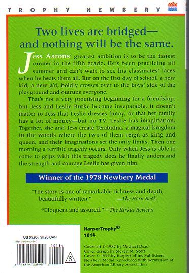 A secret world of their ownJess Aaron's greatest ambition is to be the fastest runner in the fifth grade. He's been practicing all summer and can't wait to see his classmates' faces when he beats them all. But on the first day of school, a new kid, a new girl, boldly crosses over to the boy's side of the playground and outruns everyone.That's not a very promising beginning for a friendship, but Jess and Leslie Burke become inseparable. It doesn't matter to Jess that leslie dresses funny, or that her family has a lot of money -- but no TV. Leslie has imagination. Together, she and Jess create Terabithia, a magical kingdom in the woods where the two of them reign as king and queen, and their imaginations set the only limits. Then one morning a terrible tragedy occurs. Only when Jess is able to come to grips with this tragedy does he finally understand the strength and courage Leslie has given him.