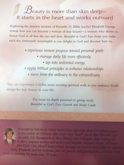 Beauty is more than skin deep-- it starts in the heart and works outward Exploring the timeless wisdom of Proverbs 31, Bible teacher Elizabeth George reveals how you can become a woman of true beauty--a woman who desires to honor God in all that she says and does. Beautiful in God's Eyes helps you make each day immensely meaningful as you delight in God and discover how to... experience instant progress toward personal goals manage daily life more effectively tap into unlimited energy apply biblical principles to enhance relationships move from the ordinary to the extraordinary You can experience a richer, more exciting spiritual walk as you embrace God's design for true beauty in your life.