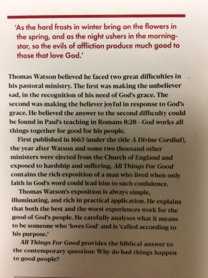 Thomas Watson's book All Things For Good provides the biblical answer to the contemporary question; Why do bad things happen to good people? Thomas Watson, the 17th century minister of St. Stephen's Walbrook, believed he faced two great difficulties in his pastoral ministry. The first was making the unbeliever sad, in the recognition of his need of God's grace. The second was making the believer joyful in response to God's grace. He believed the answer to the second difficulty could be found in Paul's teaching in Romans 8.28: God works all things together for good for his people. First published in 1663 (under the title A Divine Cordial), the year after Watson and some two thousand other ministers were ejected from the Church of England and exposed to hardship and suffering, All Things For Good contains the rich exposition of a man who lived when only faith in God's Word could lead him to such confidence. Thomas Watson's exposition is always simple, illuminating and rich in practical application. He explains that both the best and the worst experiences work for the good of God's people. He carefully analyses what it means to be someone who 'loves God' and is 'called according to his purpose'.
