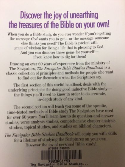 DISCOVER THE JOY OF UNEARTHING THE TREASURES OF THE BIBLE ON YOUR OWN! When you do a Bible study, do you ever wonder if you're getting the message God wants you to get-or the message someone else thinks you need? The Bible is packed with gems of wisdom for living a life that is pleasing to God. And you can discover these gems for yourself-if you know how to dig for them! Drawing on over 60 years of experience from the ministry of The Navigators, The Navigator Bible Studies Handbook is a classic collection of principles and methods for people who want to find out for themselves what the Scriptures say. The first section of this useful handbook deals with the underlying principles for doing good inductive Bible study-the things you'll need to know in order to do accurate, in-depth study of any kind. The second section will teach you some of the specific, time-tested methods of Bible study The Navigators have used for over 60 years. You'll learn how to do question-and-answer studies, verse analysis studies, comprehensive chapter analysis studies, topical studies, and studies on biblical characters. The Navigator Bible Studies Handbook will equip you with skills for a lifetime of studying the Scriptures on your own. Discover the joy of personal Bible study!