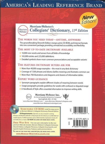 Newly Revised & Updated! The Eleventh Edition of America's Best-Selling Dictionary defines the current, active vocabulary of American English and is updated on an ongoing basis. Features more than 225,000 definitions and over 42,000 usage examples. Includes newly added words and meanings across a variety of fields including technology, entertainment, health, science, and society. Special sections include: A Handbook of Style, Foreign Words and Phrases, Biographical Names, and Geographical Names. New words include: bestie, truther, Bitcoin, listicle, binge-watch, ransomware, takeaway, woke, hack, clickbait, immersive. *BOOK COVER DESIGNS MAY VARY: We recently redesigned our Collegiate Dictionary cover so some customers may receive the original design and others may receive the new cover design.