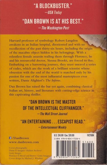 THE #1 WORLDWIDE BESTSELLER FROM THE ICONIC AUTHOR OF THE DA VINCI CODE AND THE NEW ROBERT LANGDON THRILLER, THE SECRET OF SECRETS“A book-length scavenger hunt . . . jam-packed with tricks.” —The New York Times“[A] cinematic blockbuster.” —USA TodayHarvard professor of symbology Robert Langdon awakens in an Italian hospital, disoriented and with no recollection of the past thirty-six hours, including the origin of the macabre object hidden in his belongings. With a relentless female assassin trailing them through Florence, he and his resourceful doctor, Sienna Brooks, are forced to flee.Embarking on a harrowing journey, they must unravel a series of codes, which are the work of a brilliant scientist whose obsession with the end of the world is matched only by his passion for one of the most influential masterpieces ever written: Dante Alighieri’s The Inferno.Look for more Robert Langdon novels:The Da Vinci CodeThe Lost SymbolOriginThe Secret of Secrets