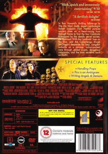 It is the time of the Sede Vacante at the Vatican as the beloved Pope has just died. As the cardinals gather to select a new pope, four of them are kidnapped by a mysterious assassin who vows to destroy Vatican City. The Vatican asks Robert Langdon (Tom Hanks) to track the mysterious clues that point to a secret scientific society called "The Illuminati" as the perpetrators of the kidnappings. Helping him are the Captain of the Swiss Guards, Commander Richter (Stellan Skarsgard) and Camerlengo Patrick McKenna (Ewan MacGregor), the former pope's chamberlain. As they track down the clues across Rome, it becomes evident that the assassin means business as they find each Cardinal dead as promised, and branded with messages. As the conclave continues, and as the timer on the bomb slowly counts down, Langdon is in a race against time to stop the destruction of the church.