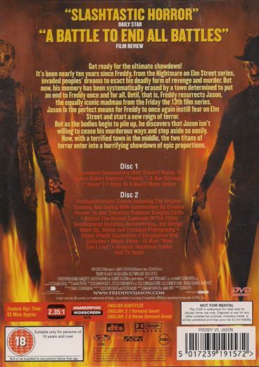 Jason Voorhees and Freddy Kruger clash in this crossover classic. Once again in the town haunted by the evil spirit that terrorizes children in thier dreams, Freddy enlists the help of Jason to terrorize and ruthlessly take revenge on the local teen population. Jason runs them down them in the waking world, while Freddy gives them the axe in the dream world. Fortunately, the teens discover that something is amiss, and investigate the town hall to uncover a dark secret. They must solve the riddle of Elm Street, all the while running from a machete wielding madman and his dream-weaving accomplice. It's not long until Jason wants the teens for himself, and the final showdown between two of the most feared supernatural horrors begins...