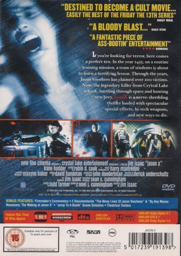 In 2008 Jason Voorhees (Kane Hodder) has been captured by the government, which is trying to figure out why he can’t be billed. Rowan (Lexa Doig) is the leader of the research project and since they cannot execute Jason prepare to freeze him. A military scientist comes to take Jason to research him for military purposes, but Jason breaks free. Rowan tricks Jason into the freezer and begins the process. Jason stabs through the chamber, stabs Rowan and they both freeze. 400 years later the earth is no longer habitable. Humans have colonized another planet called Earth 2. Professor Lowe (Jonathan Potts) is a scientist who takes his students, some Marines an android Kay-Em 14(Lisa Ryder) and goes to Earth 1 for research. They find the frozen bodies of Jason and Rowan and take them back on their ship. Rowan is thawed and woken up. The students think Jason is dead, so they just let him defrost. Jason wakes up and starts killing them. The marines are unable to kill him. The servings students and marines must try to figure out a way to stop him before they are all killed.