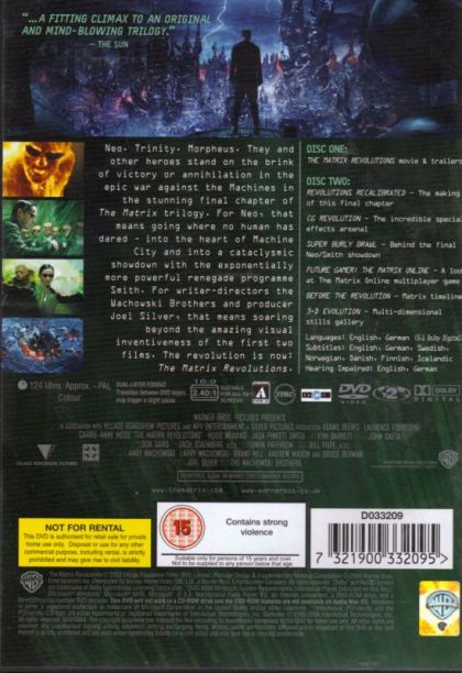 "Matrix Revolutions", the third film in the Matrix Trilogy, picks up where "Matrix Reloaded" left off. Neo is stuck in a virtual reality half-way between the Matrix and the real world. After escaping back to reality, Neo, Trinity and Morpheous must face the onslaught of the robotic creators of the Matrix, as they attempt to destroy Zion, the last Human city on earth. Neo and Trinity make a desperate voyage to the Earth's scorched surface, where they journey to the machine city to negotiate for the safety of Zion. To save Zion, Neo must venture inside the Matrix to do battle with Agent Smith, a program who has rebelled against the machines and taken control of the Matrix from them. Neo must bend the Matrix to his will once again, as he faces his final task; defeating Smith and Saving Zion.