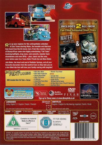 Rev up your engines for this unforgettable collection of Cars Toons starring Mater, the lovable and hilarious tow truck from the hit movie Cars. From the creative minds of Disney/Pixar come nine highly entertaining "Tall Tales" involving bullfights, drag races, rock concerts, monster truck showdowns and even UFOs - plus, check out the new, exclusive, never-before-seen Cars Toons Mater Private Eye and Moon Mater. Join Mater, the heart and soul of Radiator Springs, and all your favorite characters from the world of Cars as they take you on a fun-filled ride that will have your family roaring with laughter!