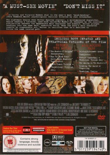 Walter Sparrow (Jim Carrey), an animal control officer, is introduced by his wife Agatha (Virginia Madsen) to a mysterious book: The Number 23. As Walter continues to read it, he notices startling similarities between the plot of the book and the events in his own life. The book's main character, a detective called The Fingerling, explains that his name came from a children's book he once read; Walter shortly thereafter finds this same book. The book continues to chronicle the life of a character called "The Suicide Blonde", a woman who is driven to insanity by the presence of the number 23 in all aspects of her life. Agatha and her son Robin (Logan Lerman) discover that by reading the 23rd word of every 23rd page, secret messages are spelled out. These messages lead Walter into a chaotic chain of events that furthers his paranoia, eventually leading him to the realization that he himself was the author of The Number 23 during his stay in a mental institution after his father's death, whose suicide note was comprised entirely of numbers adding up to 23.