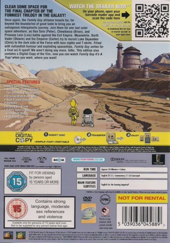 Third installment of Seth McFarlanes Star wars interpretations. In this spectacular final chapter, Luke Skywalker (Chris) and Princess Leia (Lois) must travel to Tatooine to free Han Solo (Peter) by infiltrating the wretched stronghold of Jabba the Hutt (Joe), the galaxy's most loathsome and dreadful gangster. Once reunited, the Rebels team up with a tribe of Ewoks to combat the Imperial forces on the forest moon of Endor. Meanwhile the Emperor (Carter Pewterschmidt) and Darth Vader (Stewie) conspire to turn Luke to the dark side, and young Skywalker is determined to rekindle the spirit of the Jedi within his father. The Galactic Civil War has never been more outrageous, as the Rebel forces gather to attack the seemingly defenseless and incomplete second Death Star in the battle that will determine the fate of the galaxy.