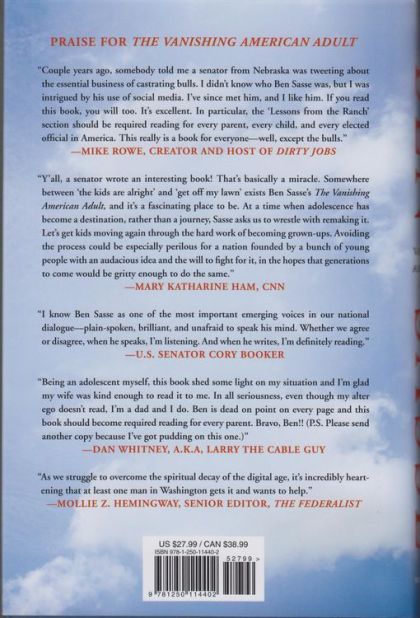 THE INSTANT NEW YORK TIMES BESTSELLERIn an era of safe spaces, trigger warnings, and an unprecedented election, the country's youth are in crisis. Senator Ben Sasse warns the nation about the existential threat to America's future.Raised by well-meaning but overprotective parents and coddled by well-meaning but misbegotten government programs, America's youth are ill-equipped to survive in our highly-competitive global economy. Many of the coming-of-age rituals that have defined the American experience since the Founding: learning the value of working with your hands, leaving home to start a family, becoming economically self-reliant—are being delayed or skipped altogether. The statistics are daunting: 30% of college students drop out after the first year, and only 4 in 10 graduate. One in three 18-to-34 year-olds live with their parents. From these disparate phenomena: Nebraska Senator Ben Sasse who as president of a Midwestern college observed the trials of this generation up close, sees an existential threat to the American way of life.In The Vanishing American Adult, Sasse diagnoses the causes of a generation that can't grow up and offers a path for raising children to become active and engaged citizens. He identifies core formative experiences that all young people should pursue: hard work to appreciate the benefits of labor, travel to understand deprivation and want, the power of reading, the importance of nurturing your body—and explains how parents can encourage them.Our democracy depends on responsible, contributing adults to function properly—without them America falls prey to populist demagogues. A call to arms, The Vanishing American Adult will ignite a much-needed debate about the link between the way we're raising our children and the future of our country.